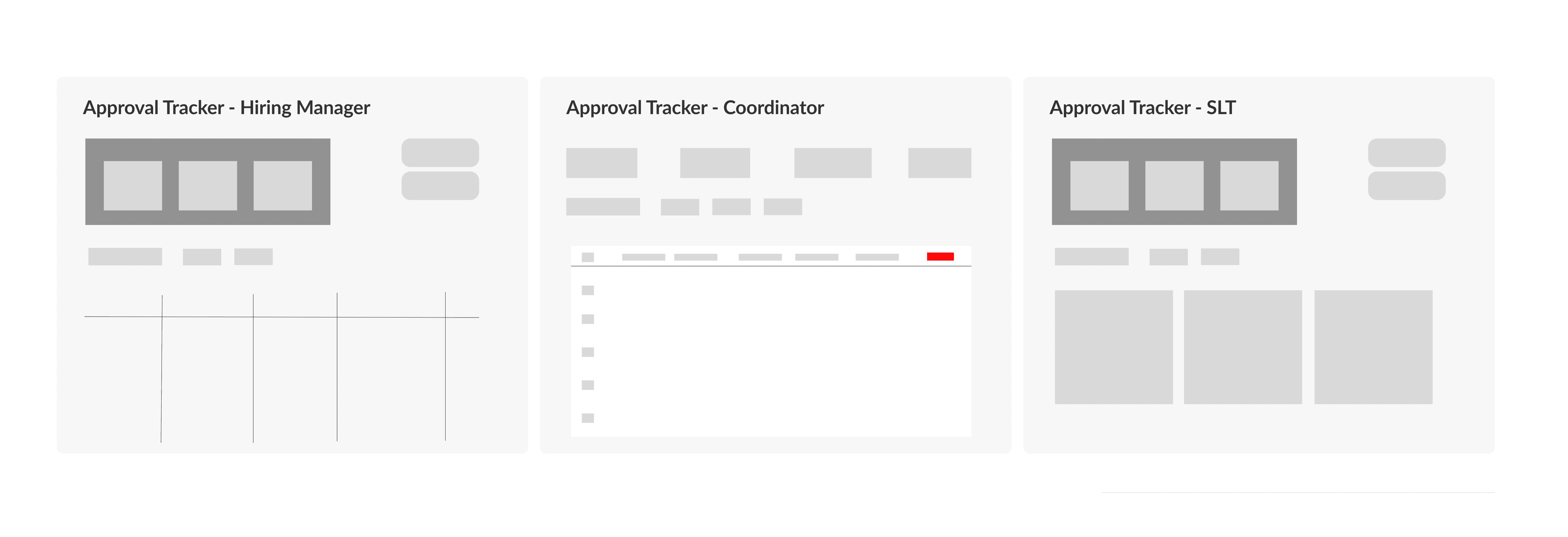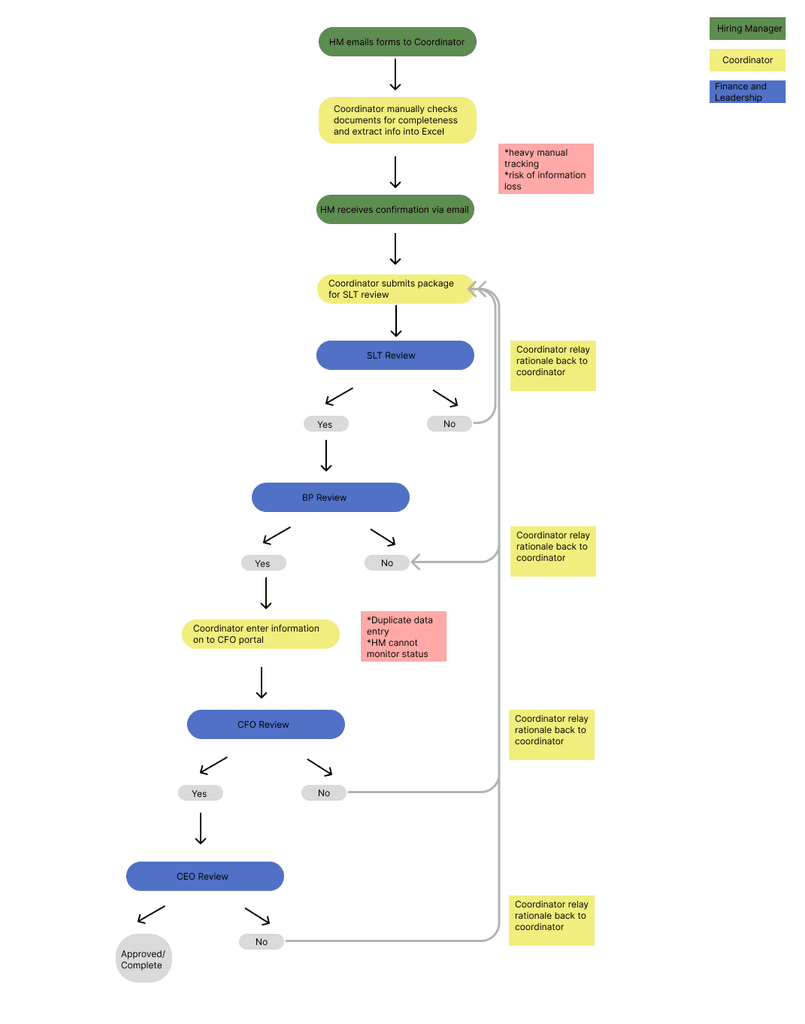 This case study was developed based on my direct observation and experience supporting approval prcess within a large healthcare enterprise. While I designed dashboards for hiring managers and coordinators, I did not include a leadership interface at this stage, as a more thorough understanding of their workflows would require dedicated interviews.
