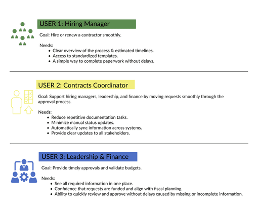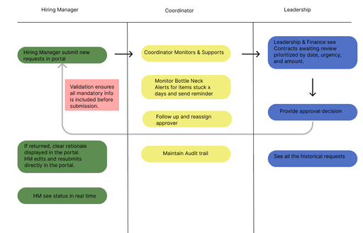 As a Project Coordinator at a healthcare enterprise, I supported internal contract approvals that required multiple handoffs between hiring managers, coordinators, finance, and leadership.